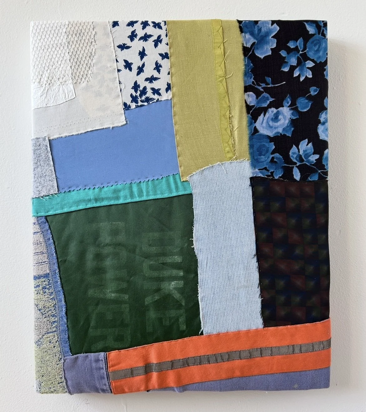 thrifted, gifted, and found fabrics on a stretched canvas, 8” x 10”, 2025